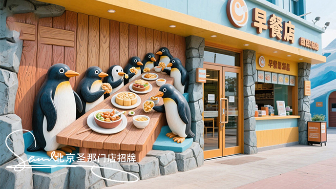 項目描述:門吊招牌以“冰川早餐”為主題,將南冰洞與早餐文化相結合,營造出一幅奇幻的場景:一群企鵝圍坐在冰桌旁用餐。通過展現可愛的形象來突出重點內容,便于人們記憶。