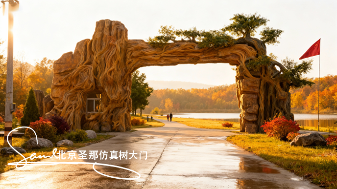 對比來看,設計圖雖保留了 “古木” 的意境,但更偏重于視覺美感;修改后的仿真樹大門實景則在安全與實用上實現(xiàn)了平衡 —— 加粗的樹根讓大門更顯穩(wěn)固,主要展現(xiàn)樹干骨架美解決了戶外仿真樹葉維護難題,調(diào)整后的燈光既保留了氛圍感,又避免了視覺雜亂。這種從 “理想設計” 到 “實景優(yōu)化” 的轉變,讓仿真樹大門既守住了設計初心,又更貼合園區(qū)的實際使用需求。
